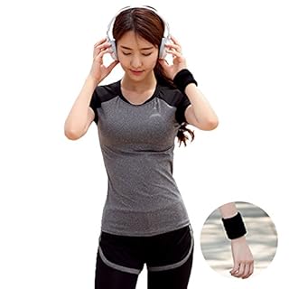 Samimi(サミミ) ヨガ ウェア スポーツ ウェア レディース 2点セット 上下 半袖 パンツ レギンス 【汗止め用おしゃれなリストバンド付き】 (グレー, M)